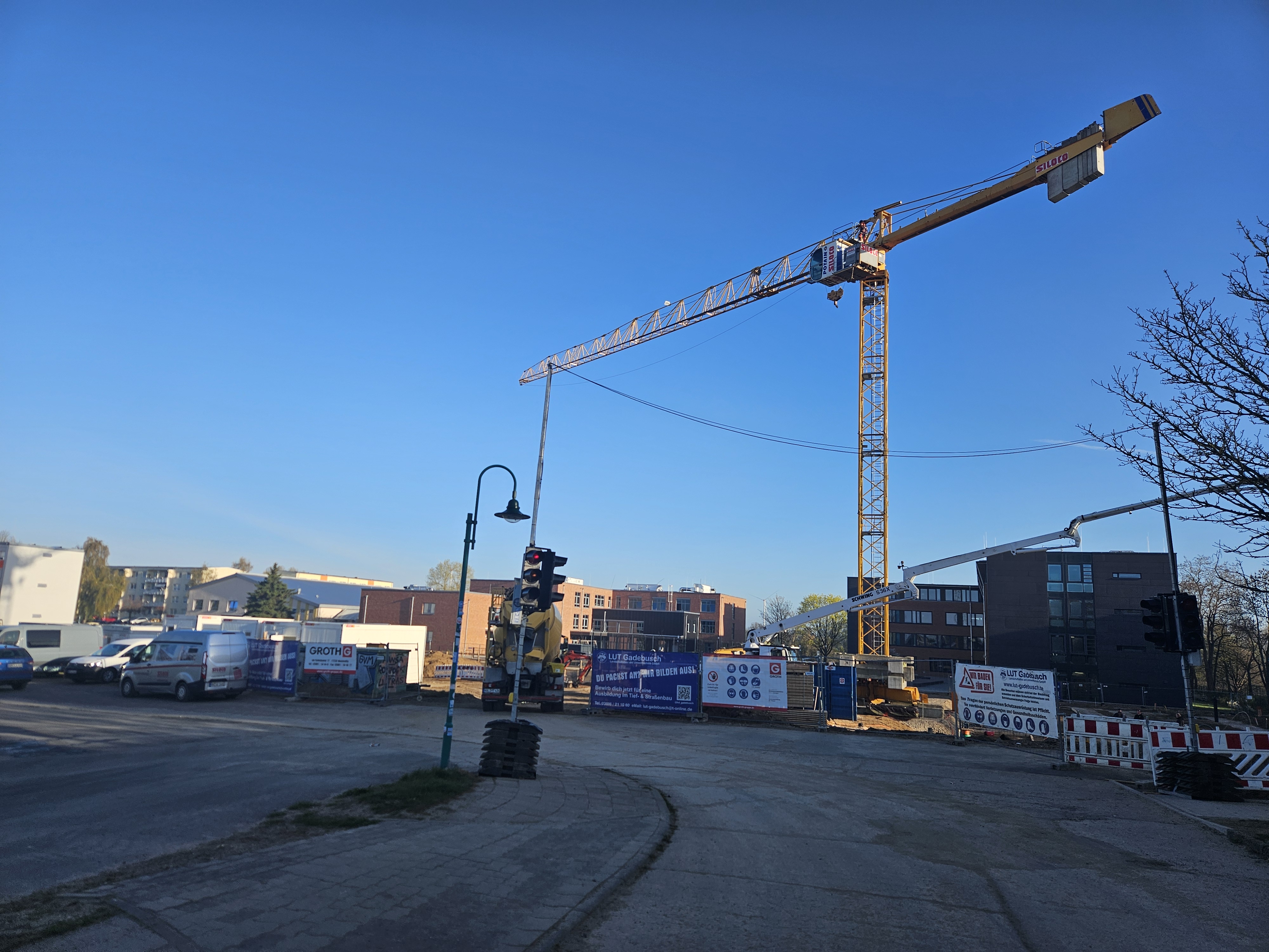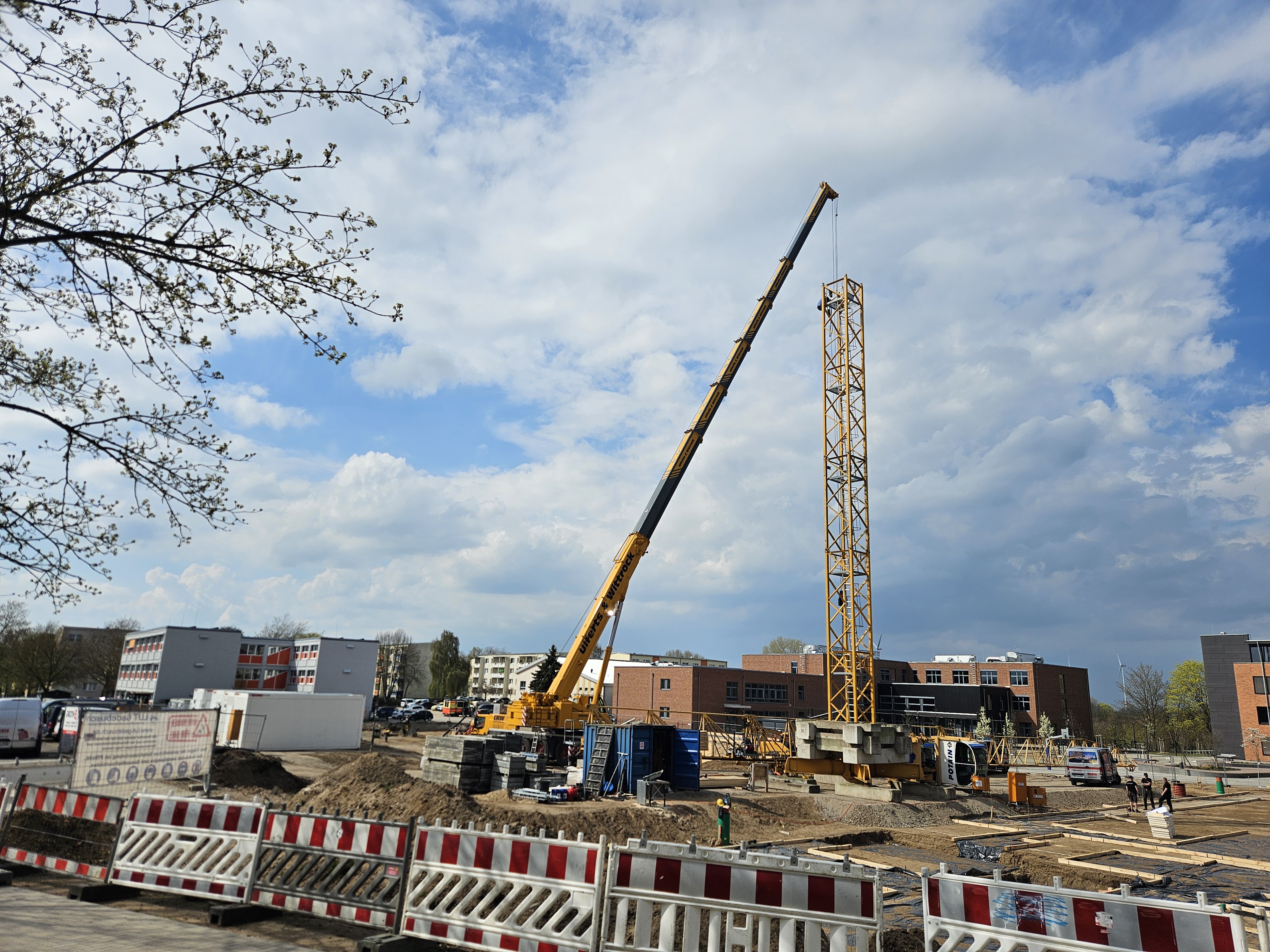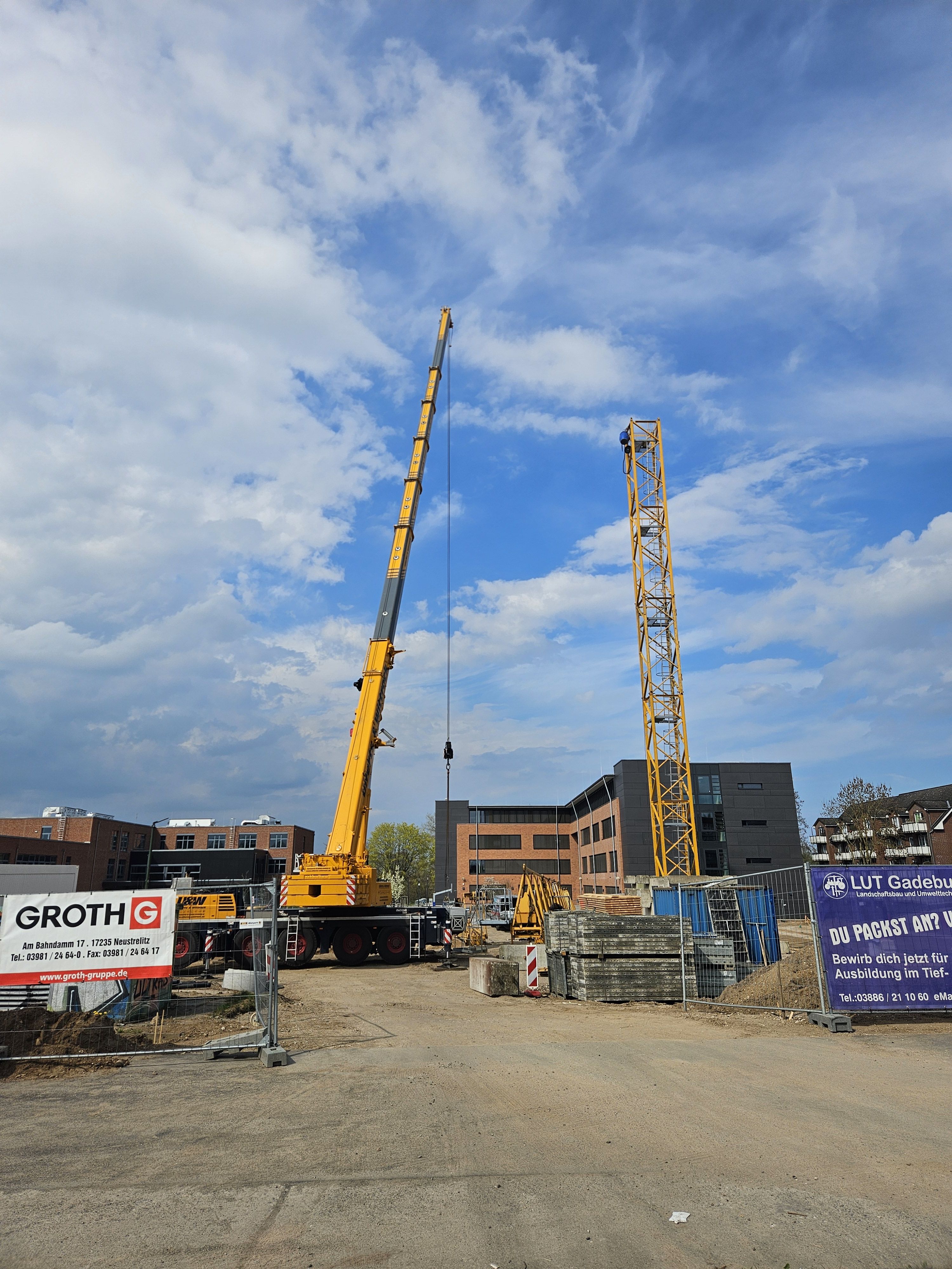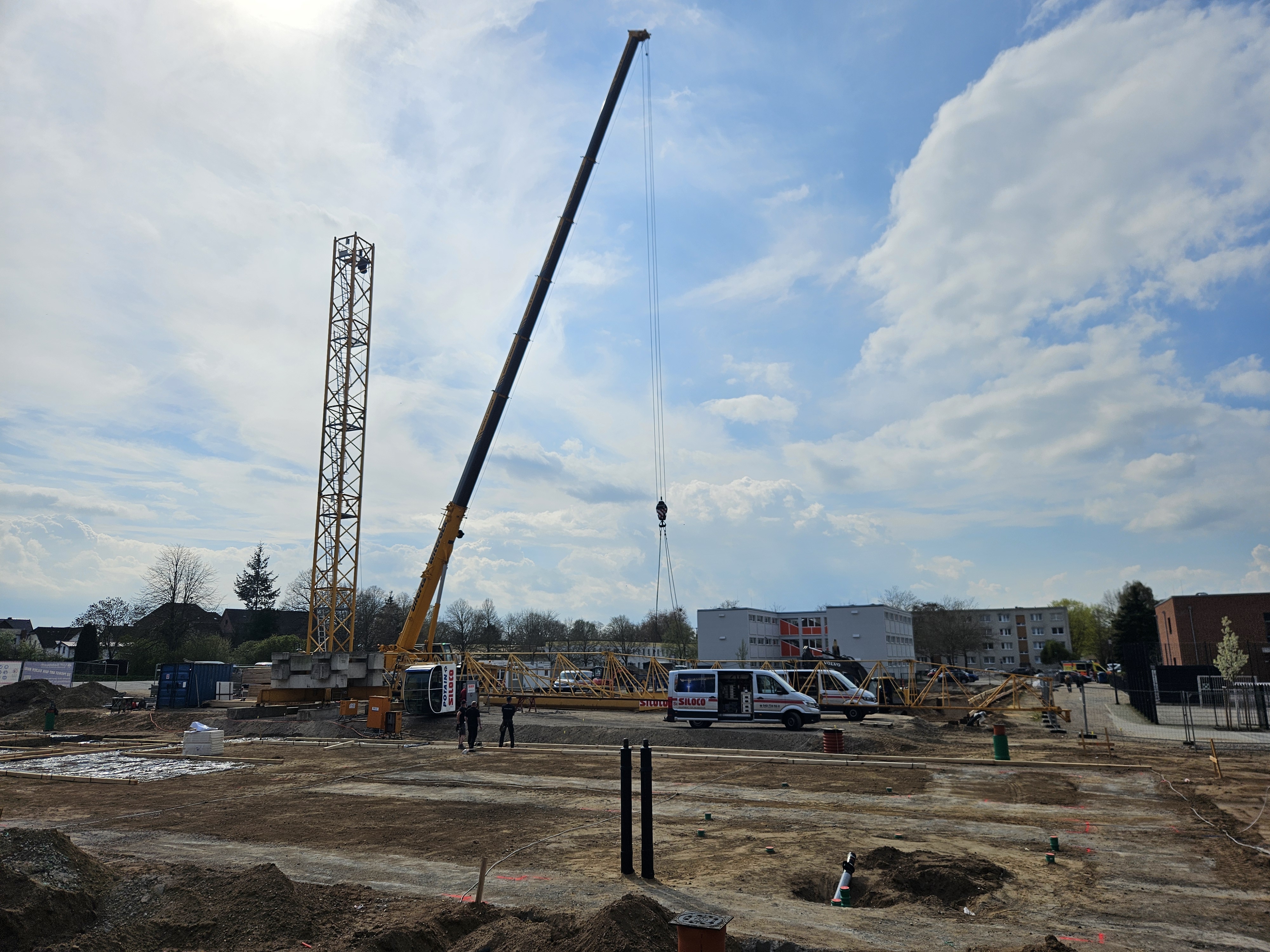 Immer mehr zu sehen auf der größten Baustelle in Grevesmühlen. Zeitgleich zu den Schacht- und Fundamentarbeiten begann heute der Aufbau des großen Baukrans am Schulcampus.