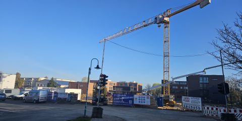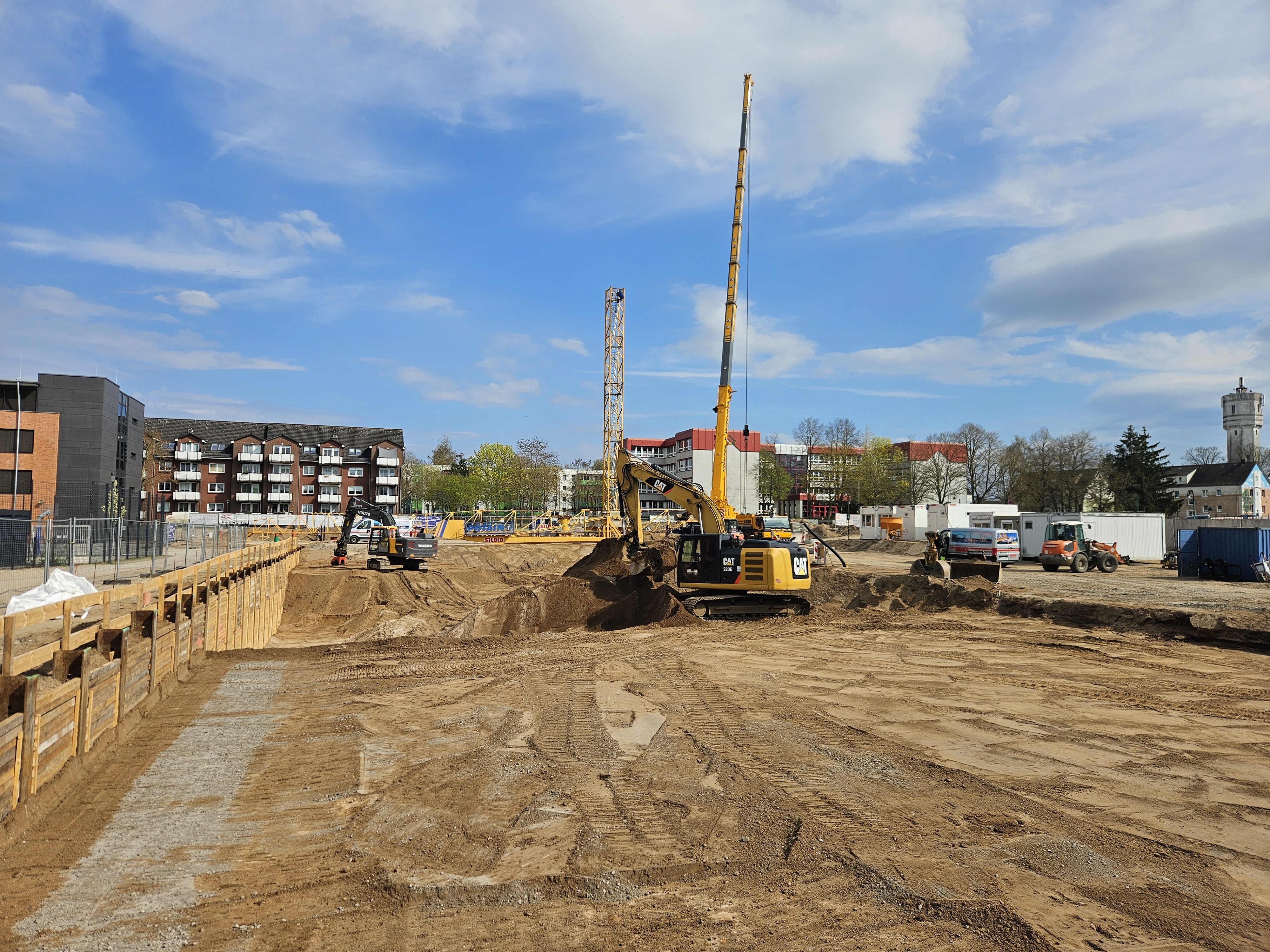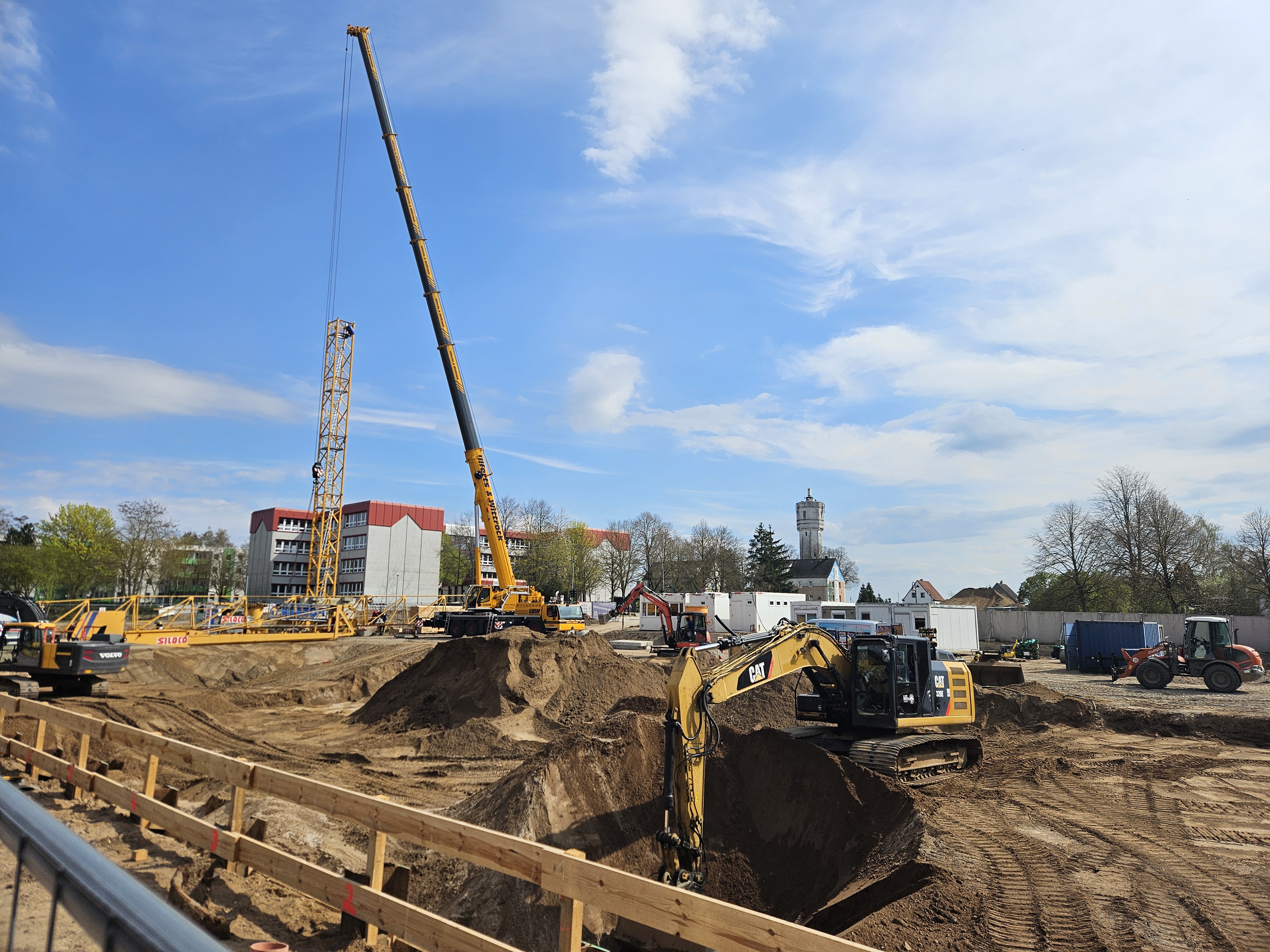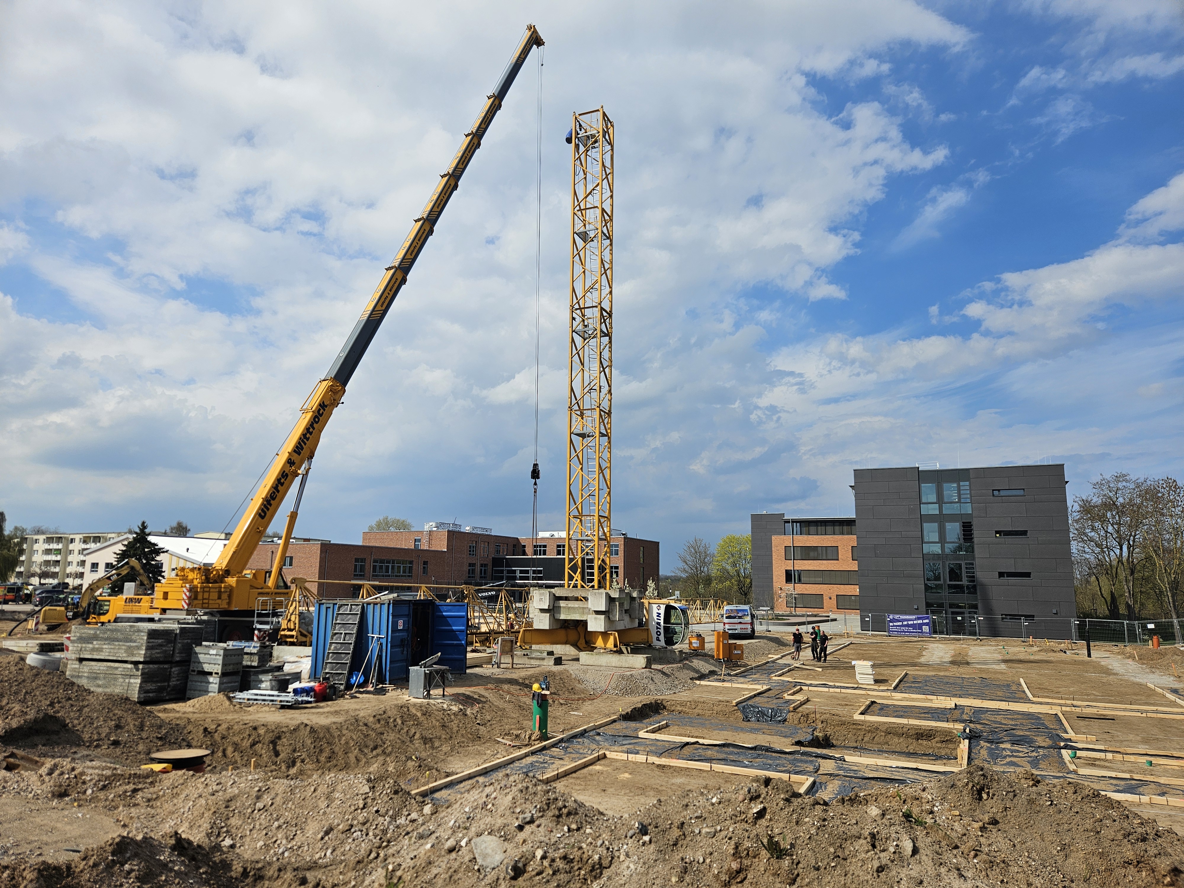 Immer mehr zu sehen auf der größten Baustelle in Grevesmühlen. Zeitgleich zu den Schacht- und Fundamentarbeiten begann heute der Aufbau des großen Baukrans am Schulcampus.