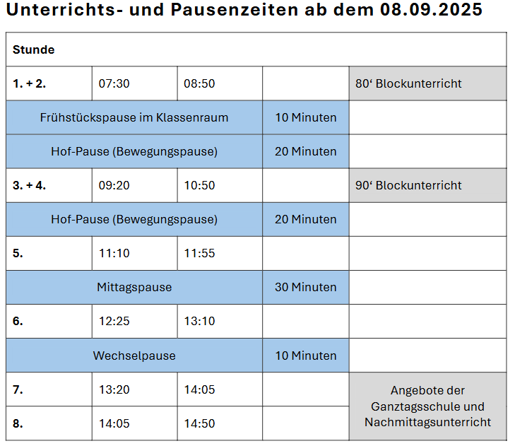 Unterrichts- und Pausenplan